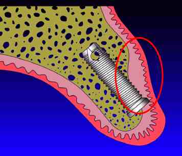 インプラント治療は… 1.顎の骨にインプランを植立する外科処置と 2.インプラントが骨と接合した後(外科処置後2~5ヶ月)冠を被せる補綴処置の2つのステージに分ける事ができます。 1の外科ステージにおいては患者さんの条件さえ良ければ技術的(埋入する外科処置)には、大学卒業後数年の経験しかない歯科医でも難しいものではありません。 問題になるのは、骨格的にキャシャな日本人の場合、 薄い骨(主に頬側:図1)が多く吸収し無くなりやすい為、欧米人に比べ条件の良くないケース=難しいケース(インプラントが骨からはみでる:図2)が多く、これが失敗の原因になる事が多いのです。 図1